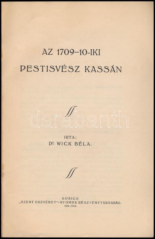 Dr. Wick Béla: Az 1709-10-iki pestisvész Kassán. Kosice, 1934, Szent Erzsébet Nyomda. Kiadói papírkötés, képekkel illusztrált, az akkori városi tisztviselők, mesteremberek név szerinti listájával, szép állapotban.