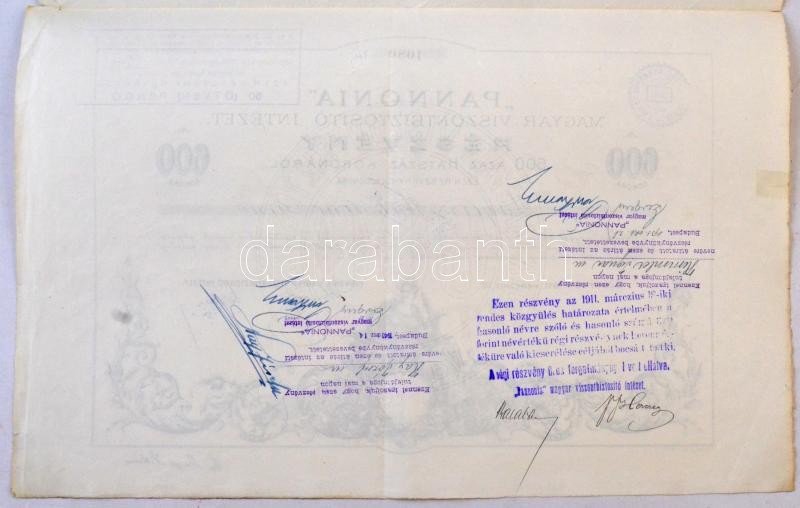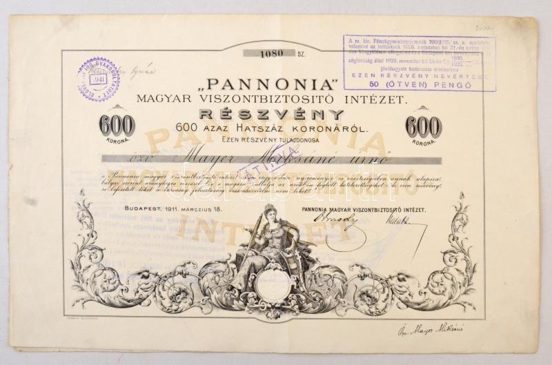Budapest 1911. "Pannónia Magyar Viszontbiztosító Intézet" né... https://www.darabanth.com/de/325-Fernauktion/325.0/Numismatik/Aktien-und-Tickets~2000005/Budapest-1911-Pannonia-Magyar-Viszontbiztosito-Intezet-nevre-szolo-reszvenye-600K-rol-~II1810583