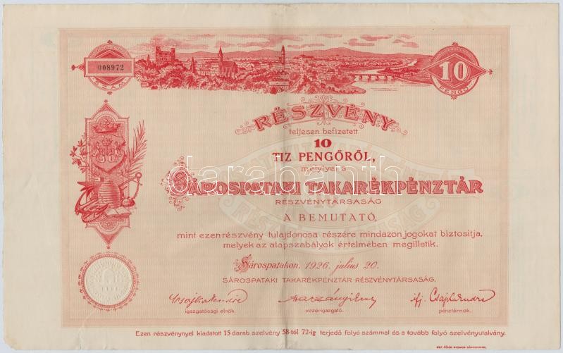 Sárospatak 1926. "Sárospataki Takarékpénztár Részvénytársaság&quo... https://www.darabanth.com/de/325-Fernauktion/325.0/Numismatik/Aktien-und-Tickets~2000005/Sarospatak-1926-Sarospataki-Takarekpenztar-Reszvenytarsasag-reszvenye-10P-rol-szara~II1809700