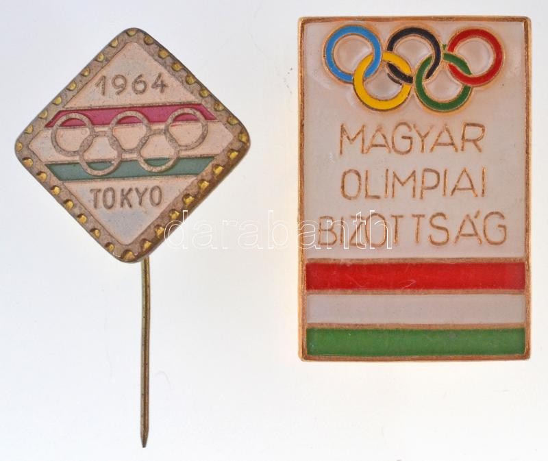 Beschreibung: 1964. "Tokyo" olimpiai kitűző (21x21mm) + ~1964. "Magyar Olimpiai Bizottság" műgyantás, festett(?) jelvény (21x31mm) T:2