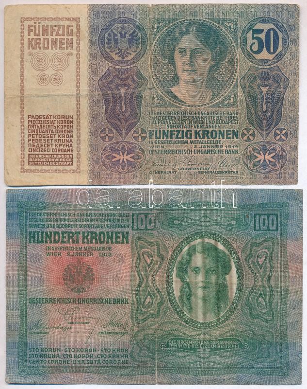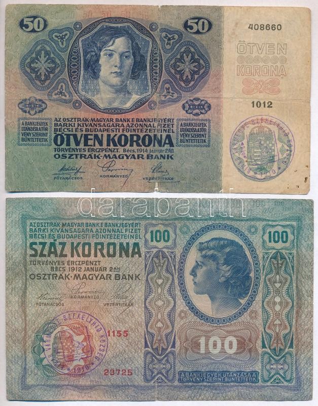 Beschreibung: 1912. 100K + 1914. 50K mindkettő hamis "Bihar Vármegye Székelyhíd Község 1910" felülbélyegzéssel (fake overprint) T:III-