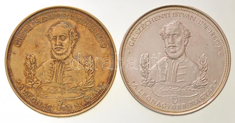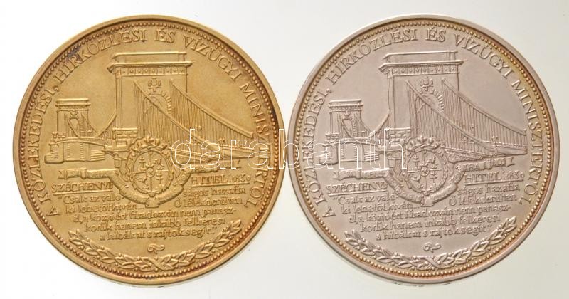 ~1990. "Gr. Széchenyi István (1791-1860) A Legnagyobb Magyar / A Közlekedési, HÃrközlési és VÃzügyi MiniszertÅ‘l" Ag és aranyozott Ag emlékérem pár (2x) peremen jelzett, sorszámozott. Kiadatlan tÃpus, az éremképet késÅ‘bb megváltoztatták. Szign.: Bozó/SzG. (36,50g és 36,11g/0.925/42,5mm) T:1- / Hungary ~1990. "Count István Széchenyi (1791-1860) The Greatest Hungarian" Ag and gilt Ag commemorative medal pair (2x) marked and numbered on edge. Unissued type, the image on the coin was later changed. Sign: Bozó/SzG. (36,50g és 36,11g/0.925/42,5mm) C:AU