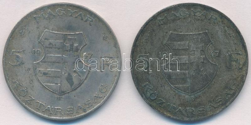 1947. 5Ft Ag "Kossuth" (2x) T:2-,3 patina https://www.darabanth.com/de/325-Fernauktion/325.0/Numismatik/Ungarische-Munzen-und-Munzen-mit-ungarischem-Munzzeichen~2000008/1947-5Ft-Ag-Kossuth-2x-T2-3-patina~II1810963