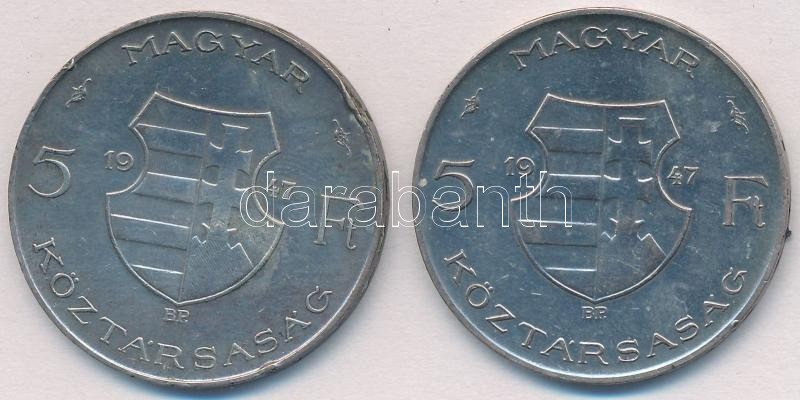 1947. 5Ft Ag "Kossuth" (2x) T:2- https://www.darabanth.com/de/325-Fernauktion/325.0/Numismatik/Ungarische-Munzen-und-Munzen-mit-ungarischem-Munzzeichen~2000008/1947-5Ft-Ag-Kossuth-2x-T2-~II1810959