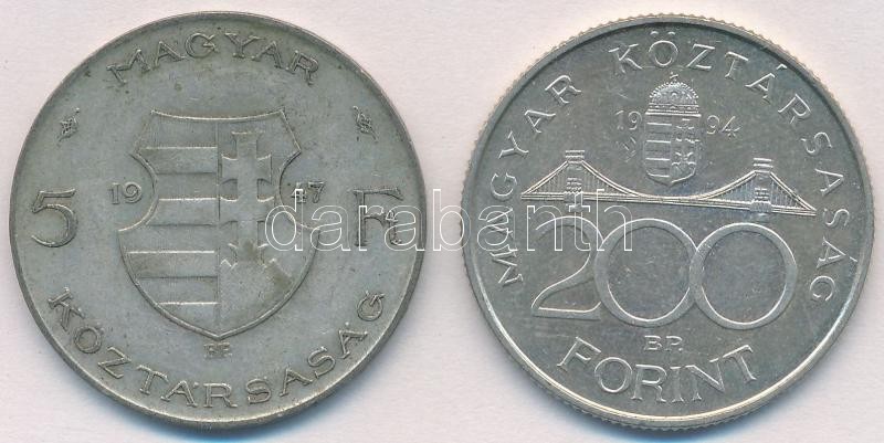 Beschreibung: 1947. 5Ft Ag "Kossuth" + 1994. 200Ft Ag "Deák" T:2,2- patina