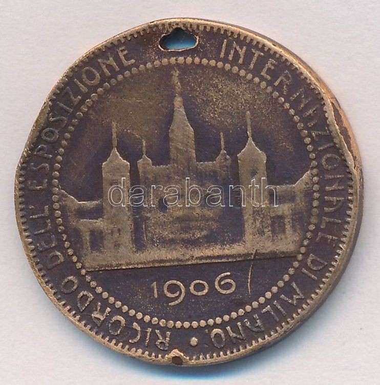 Olaszország 1906. "Internazionale di Milano - Ricordo dell'Esposizione" fém emlékére a milánói kiállítás emlékére (29mm) T:3 durva ph., ly. Italy 1906. "Internazionale di Milano - Ricordo dell'Esposizione" metal commemorative medal (29mm) C:F strong edge error, hole