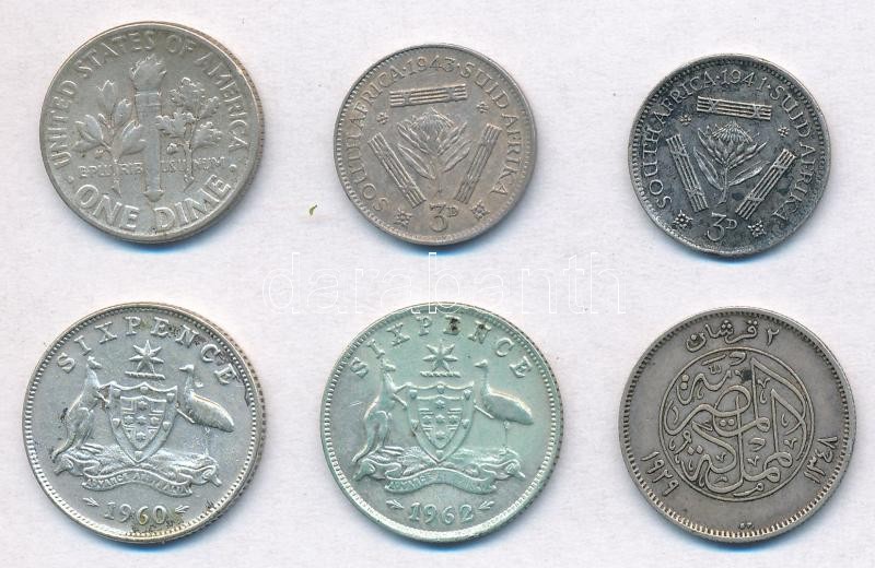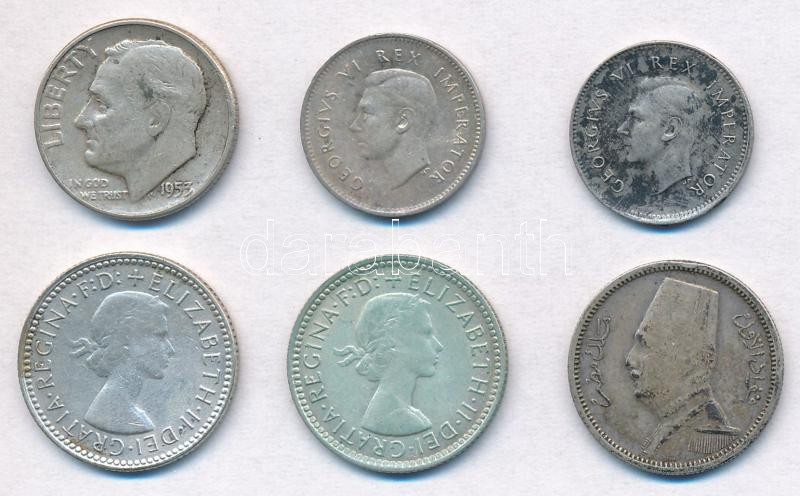 6db-os vegyes külföldi ezüstpénz tétel, közte Amerikai Egyesült Államok 1953. 1d Ag "Roosevelt"; Ausztrália 1960. 6p Ag; Egyiptom 1929. 2P Ag T:2,2- patina