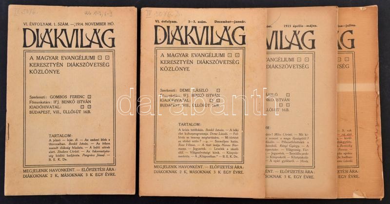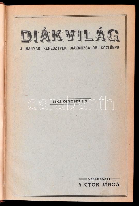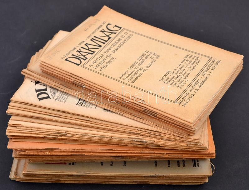 1909-1934 Diákvilág. Különféle számainak gyűjteménye: I. évf. 1-10.sz.+ II. évf. 1-8.,10. sz.+ III. évf. 1-3.,5-10. sz.+IV. évf.1-10. sz.+ V. évf.1-10. sz.,+Magyar Evangéliumi Keresztyén Diákszövetség évkönyve 1912-1913.+VI. évf. 1-3., 6-9. sz.+VII. évf. 1-3.,7. sz.+VIII. évf. 3-4. sz.+XV. évf. 3-4. sz.+ XVI. évf. 5-10. sz.+XVII. évf. 1-4.,7-8. sz.+XVII. 1.,4-8.,10. sz.+XIX. sz. 1-2.,4-10. sz.+XX. évf. 1.,4-10. sz.+XXI. évf. 1-8. sz.+XXII. évf. 1-9. sz.+XXIII. évf. 1-10. sz.+XXIV. évf. 2-10 sz. A Magyar Keresztény Diákmozgalom Közlönye, majd a Magyar Evangeliumi Keresztyén Diákmozgalom közlönye. Részben átkötött félvászon-kötésben, részben papírkötésben változó állapotban.