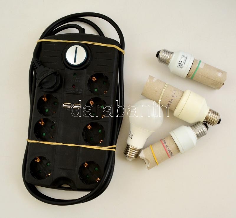Beschreibung: 8-as elosztó USB töltőcsatlakozóval, túlfeszültség védelemmel, 2,5 m vezetékkel, 4 db használt energiatakarékos izzó