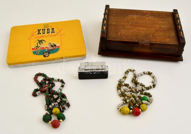 Beschreibung: Kis bolha tétel: Consul öngyújtó, működik + 2 db bizsu nyaklánc + kubai szivaros fém doboz + dekortatív fa doboz, 17×12,5×5,5 cm