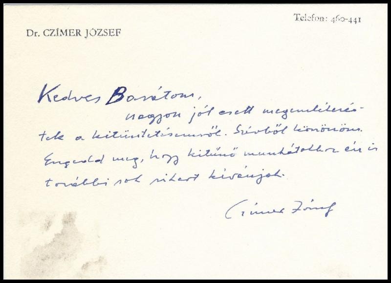 1983 Dr. Czímer József (1913-2008) dramaturg, esztéta, író, műfordítónak az üdvözlő sorai és aláírása egy Szilágyi Dezső (1922-2010) bábművésznek, az Állami Bábszínház igazgatójának szóló levélen, borítékban