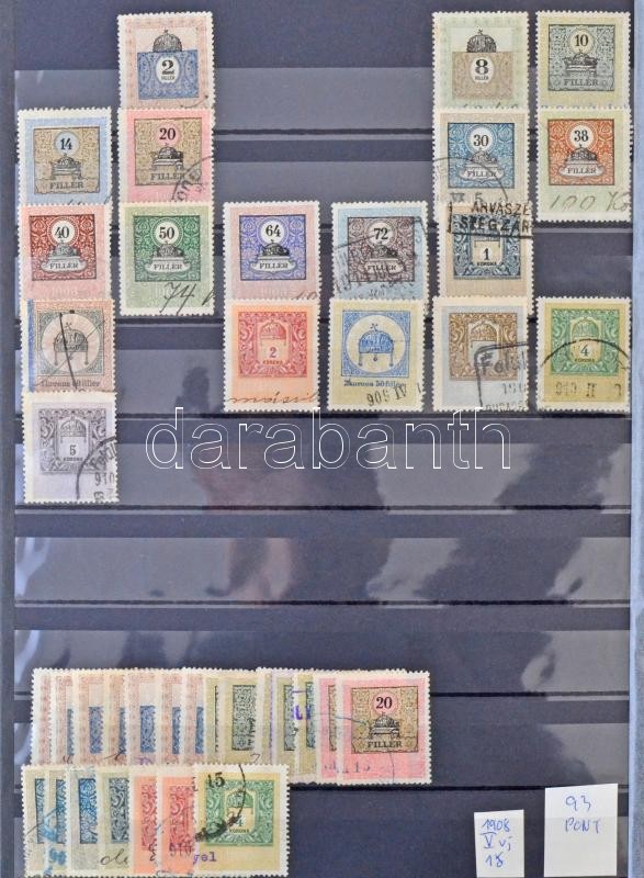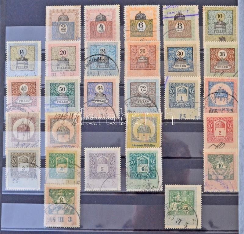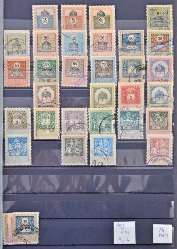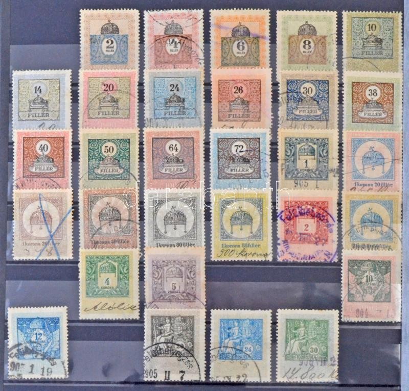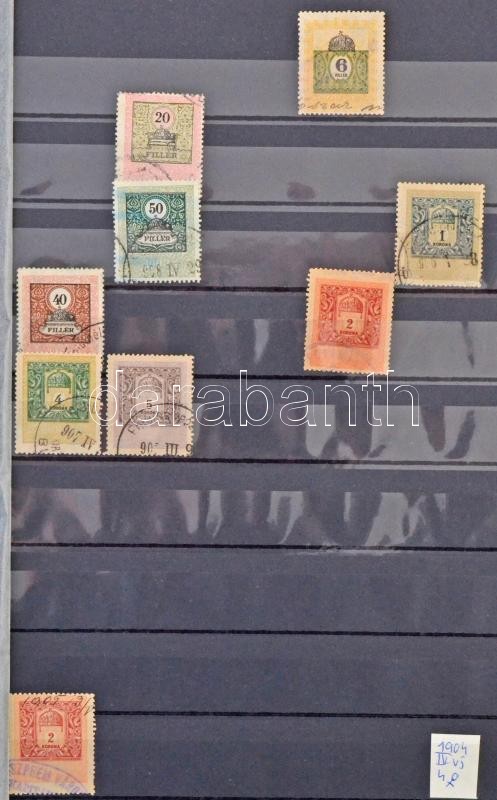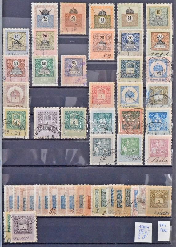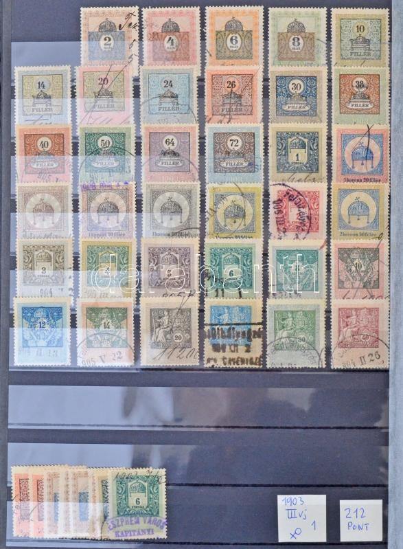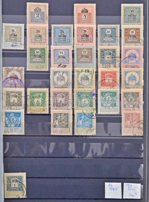 443 darabos okmánybélyeg vízjelállás gyűjtemény 1903-1909 közte rengeteg számvízjel és csillag, hozzá sok másodpéldány 32 lapos A/4 berakó 27 oldalán. Tartalmas anyag!! Mindenről készült kép!! / Collection of document stamps watermark positions, 443 different + a lot of duplicates, very rich material with a lot of VI. and stars on 27 pages of an A/4 stockbook. All scanned!!