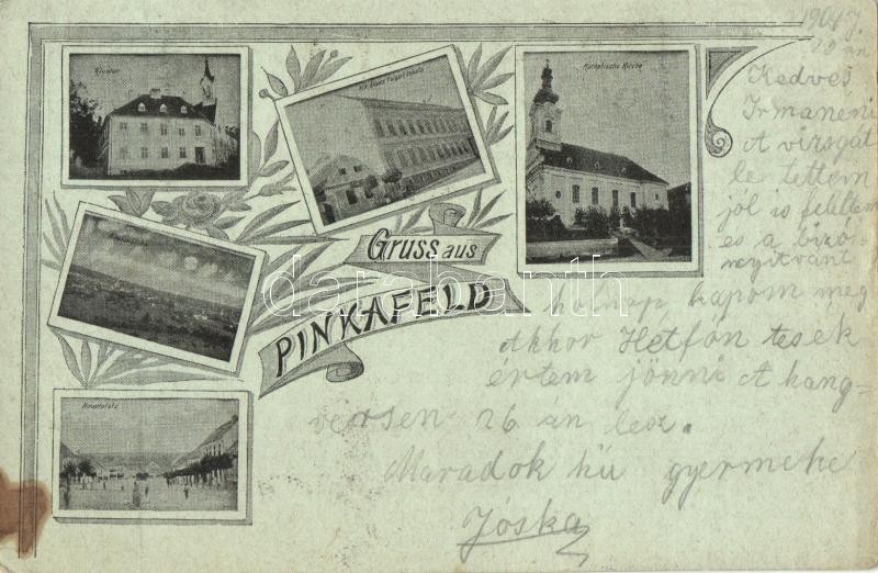 1904 Pinkafő, Pinkafeld; Kloster, Hauptplatz, Schule, Katholische Kirche / Zárda, M. k. állami polgári iskola, Fő tér, Római katolikus templom / monastery, school, main square, Catholic church. Art Nouveau, floral (EK)
