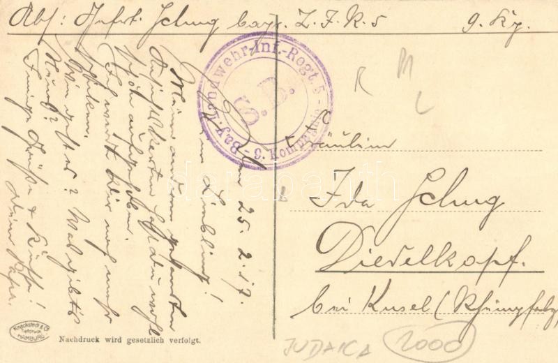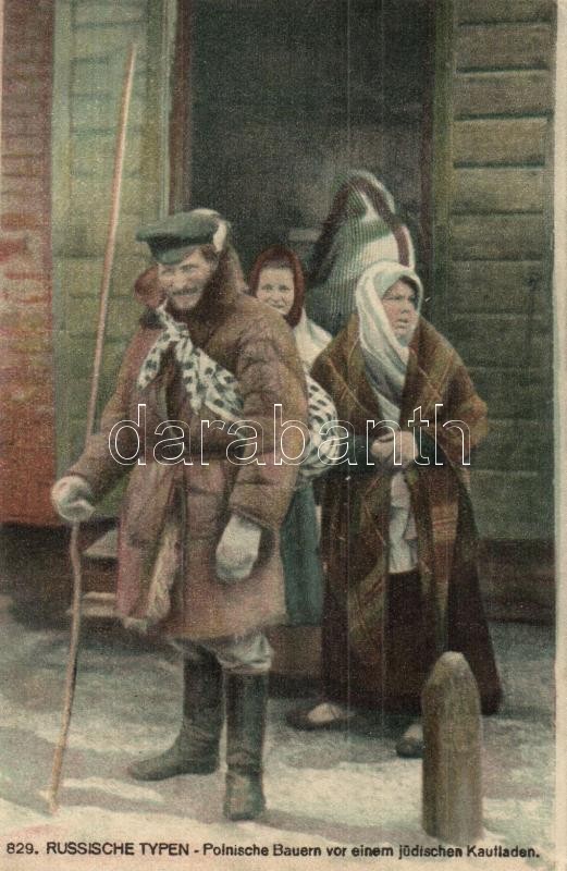 829. Russische Typen, Polnische Bauern vor einem jüdischen Kaufladen / Polish farmers in front of a Jewish shop. Judaica + Bay. Landwehr-Inf.-Regt. 5. 9. Kompagnie