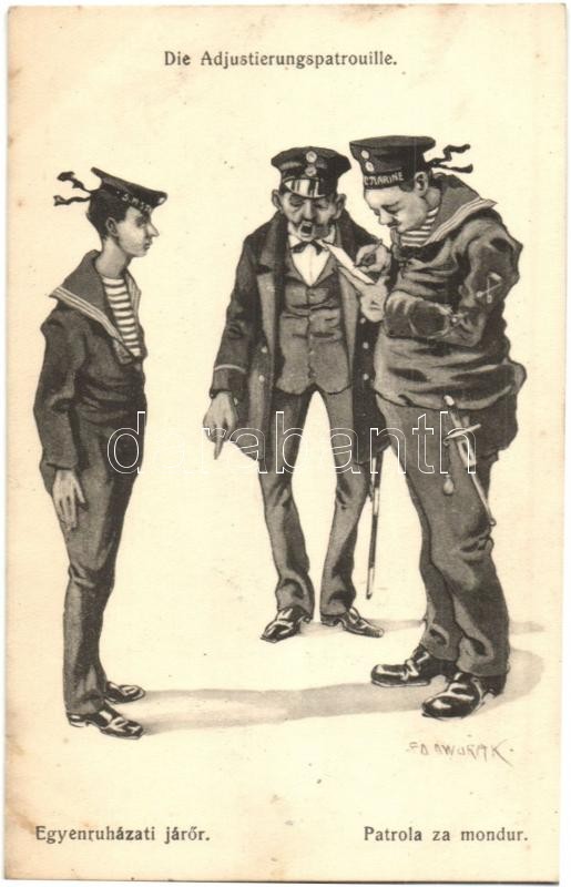 Die Adjustierungspatrouille/ Egyenruházati járőr / Patrola za mondur / K.u.K. Kriegsmarine humour, C. F. P. 1917/18 s: Ed. Dworak + "Zensuriert SM Dampfer IV.