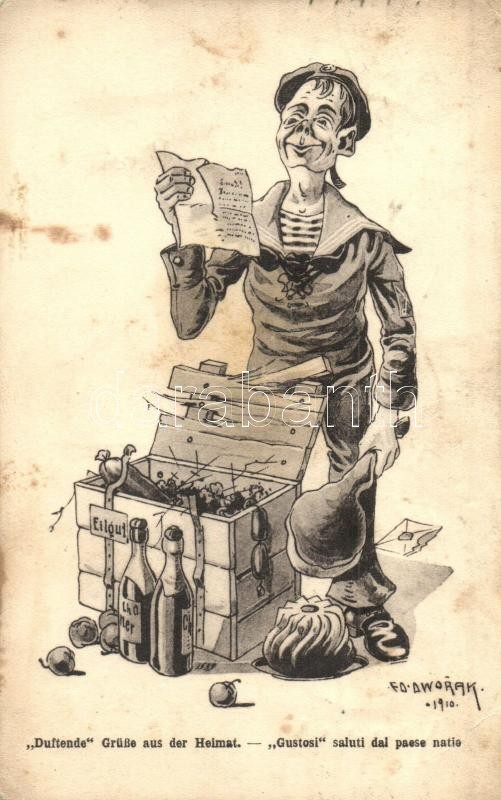 Beschreibung: Duftende Grüsse aus der Heimat / Gustosi saluti dal paese natio / K.u.K. Kriegsmarine mariners humour art postcard. G. Fano 2102. s: Ed. Dworak (EK)