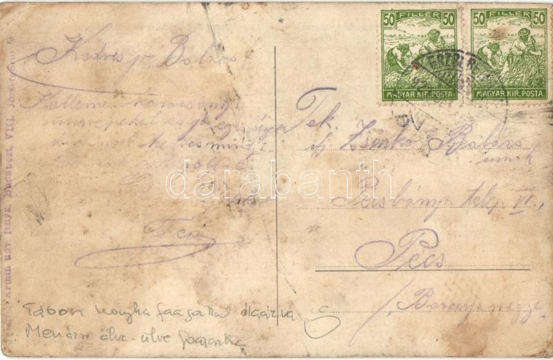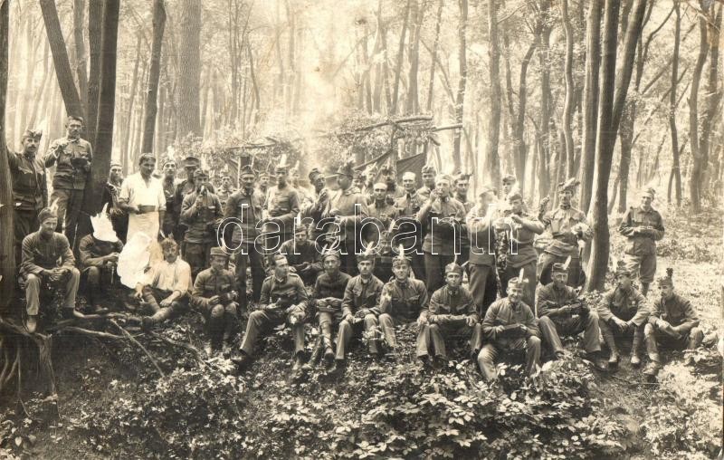 Első világháborús osztrák-magyar tábori konyha faágakkal álcázva, katonák csoportképe / WWI K.u.K. military camouflaged field kitchen with soldiers group photo (EK)