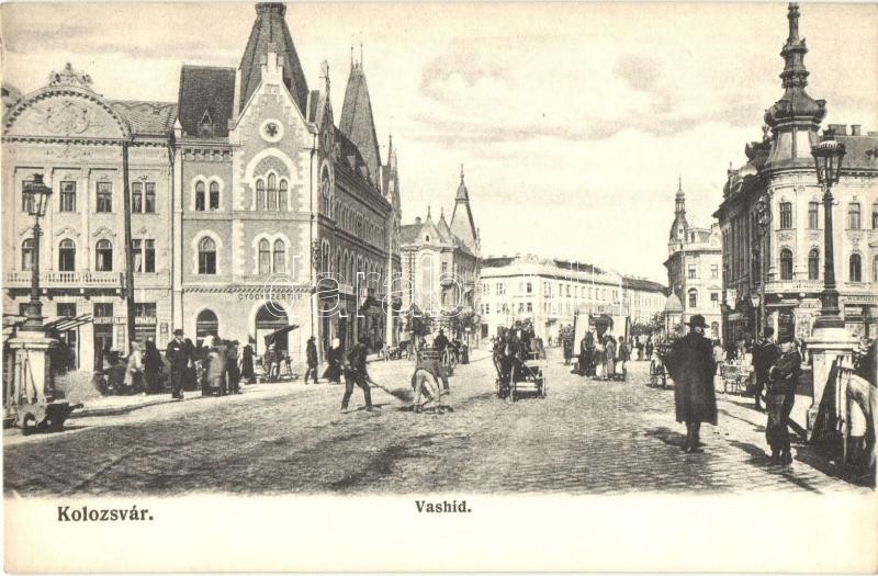 Beschreibung: Kolozsvár, Cluj; Vashíd, Gyógyszertár, üzletek, utcaseprők. Schuster Emil kiadása / bridge, pharmacy, shops, street sweepers