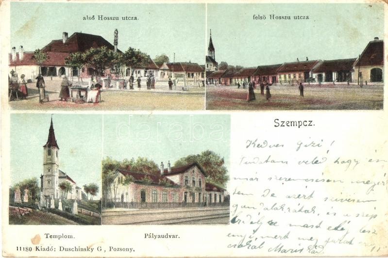Szenc, Szempcz, Senec; Alsó Hosszú utca, Felső Hosszú utca, üzletek, piaci árusok, Szentháromság szobor, Római katolikus templom, Vasútállomás. Duschinsky G. kiadása / street view, shops, market vendors, Trinity statue, Catholic church, railway station (vágott / cut)
