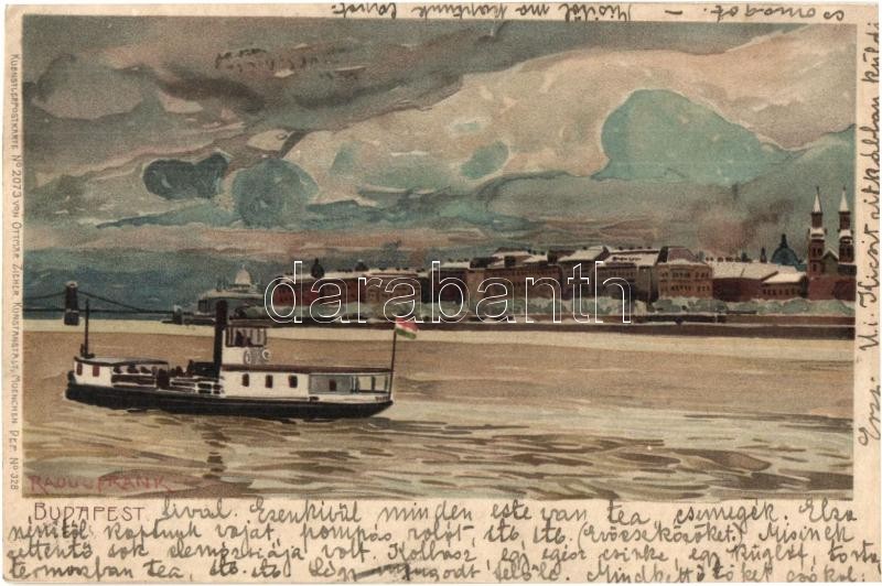 Beschreibung: Budapest, Lánchíd, gőzhajó. Ottmar Zieher Kuenstlerpostkarte No. 2073. litho s: Raoul Frank (r)