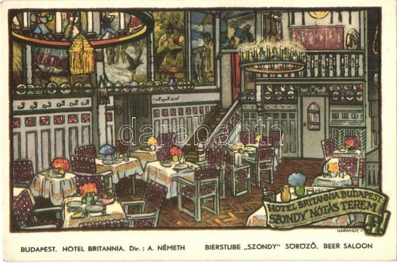 Budapest VI. Hotel Britannia, Szondy söröző s: Haranghy J. https://www.darabanth.com/de/326-Fernauktion/326.0/Ansichtskarten/Ungarn~2500002/Budapest-VI-Hotel-Britannia-Szondy-sorozo-s-Haranghy-J~II1812709