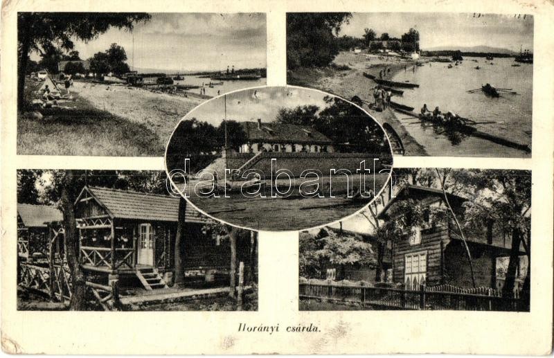 Beschreibung: Szigetmonostor, Horányi csárda, fürdőzők, evezősök, sport. Grünböck Béla kiadása (EK)