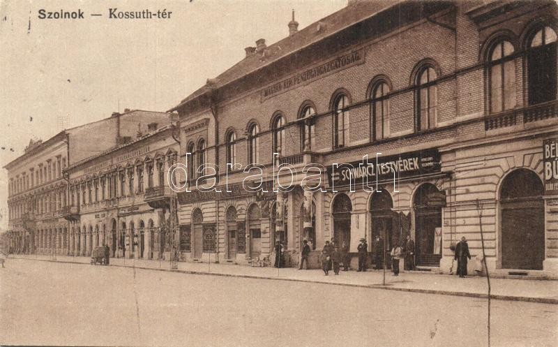 Beschreibung: Szolnok, Kossuth tér, Magyar kir. pénzügyigazgatóság, Magyar takarékpénztár, Jancsó és Schwarcz testvérek üzlete