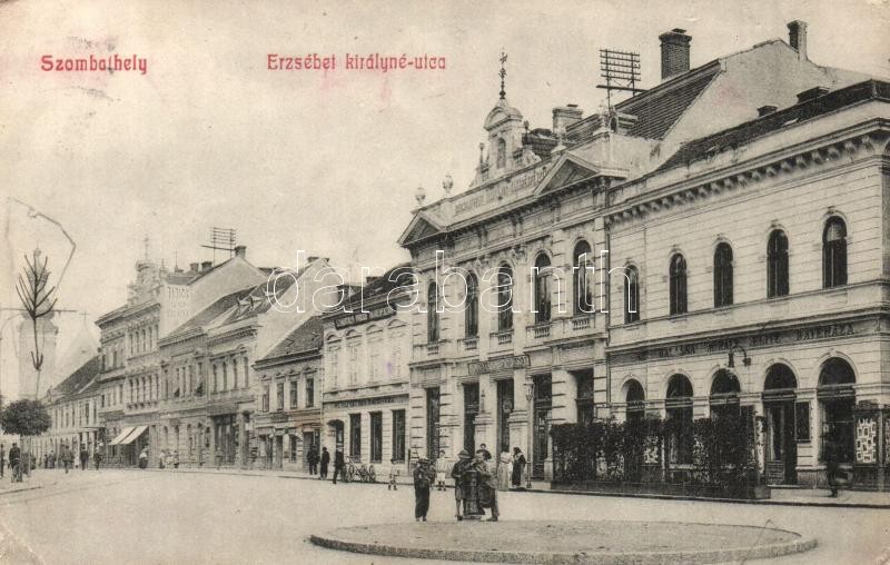 Beschreibung: Szombathely, Erzsébet királyné utca, Balassa Mihály Café Elite kávéháza, Heigl István kávéháza, Takarékpénztár, üzletek (EK)
