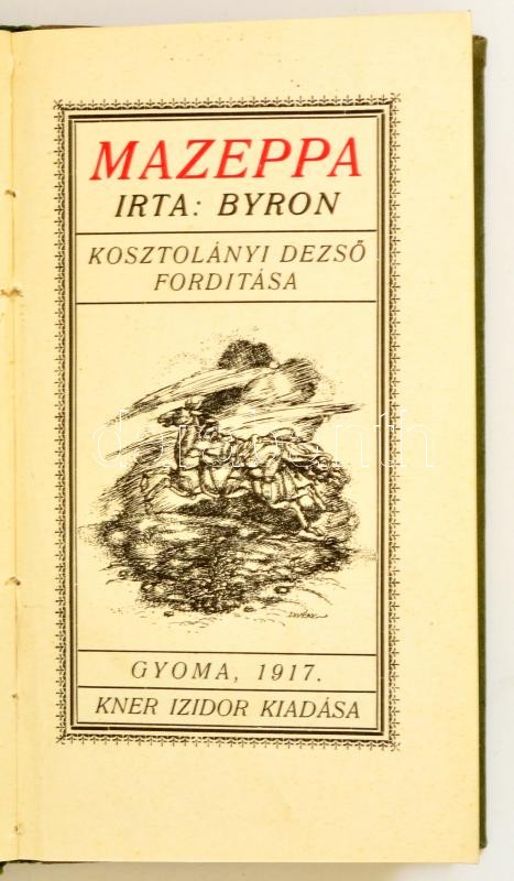 Byron: Mazeppa. Gyoma, 1917, Kner Izidor kiadása. Kosztolányi Dezső fo... https://www.darabanth.com/de/326-Fernauktion/326.0/Bucher/Bucher-Andere-kuriositaten~1500020/Byron-Mazeppa-Gyoma-1917-Kner-Izidor-kiadasa-Kosztolanyi-Dezso-forditasa-korabeli-kemeny~II1722620