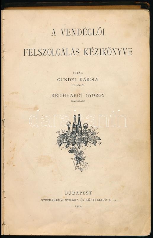 Gundel Károly-Reichardt György: A vendéglői felszolgálás kézikönyve.+Palkovics Ede-Dittmayer Andor: A szakácsművészet kézikönyve. Bp.,1926-1925, Stephaneum-Franklin. Átkötött félvászon-kötés, rossz állapotban, a második bekötött munka hiányos (64-77. oldalak között), a gerince sérült, a borítója sérült, kopott, sérült kötéssel, egy kijáró lappal, egy-két javított lappal.