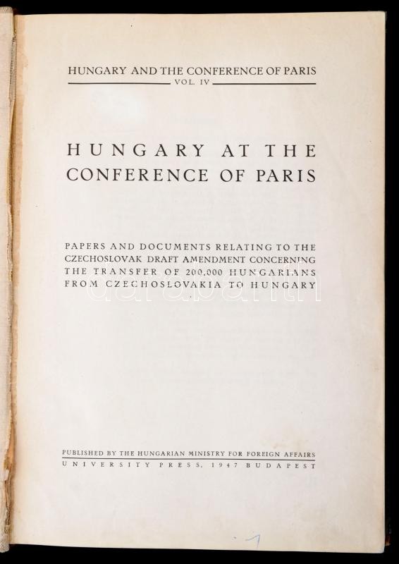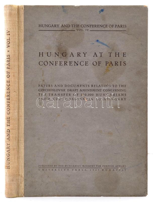 Hungary at the Conference of Paris IV. Papers and documents relating to the Chechoslovak draft amendment concerning the transfer of 200 000 Hungarians from Czechoslovakia to Hungary. Bp., 1947. Hungarian Ministry of Foreign Affairs- A Párizsi Békekonferenciára készült magyar kiadvány a csehszlovák lakosságcsere kapcsán 201p. térképekkel, köztük kihajthatóak is. Kissé foltos félvászon kötésben. / With fold out maps. In half linen binding.