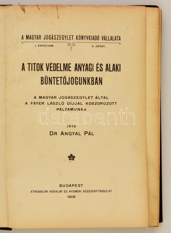 1908 Dr. Angyal Pál: A titok védelme anyagi és alaki bűntetőjogunkban. A magyar jogászegylet által a Fayer László díjjal koszorúzott pályamunka. Magyar Jogászegylet Könyvkiadó Vállalata. I. évf. 5. kötet. Bp.,1908, Athenaeum, 172 p. Kiadói aranyozott egészvászon-kötés, kopott borítóval.