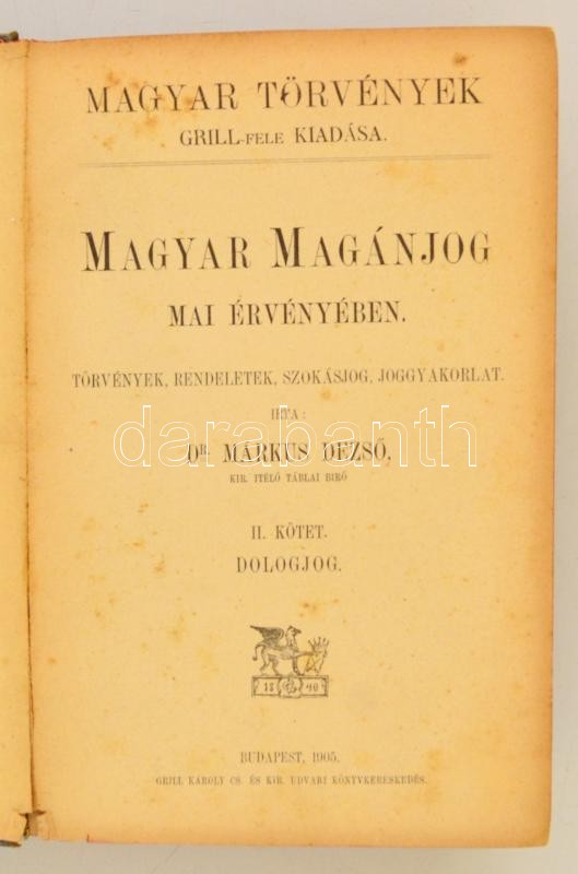 Márkus Dezső: Magyar Magánjog. II. Dologi jog. Bp., 1905 Grill. 827p. ... https://www.darabanth.com/de/326-Fernauktion/326.0/Bucher/Bucher-Jura~1500004/Markus-Dezso-Magyar-Maganjog-II-Dologi-jog-Bp-1905-Grill-827p-Korabeli-kisse-piszkos-egC3~II1817654