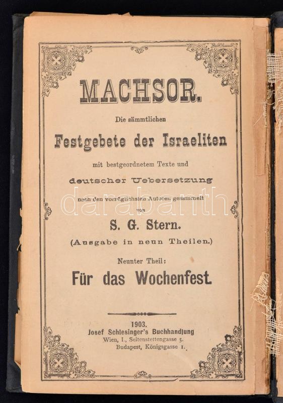 Stern, S. G.: Machsor. Die sämmtlichen Festgebete der Israeliten. Wien, 1903, Josef Schlesinger. Héber és német nyelven. Sérült, részben elváló vászonkötésben.