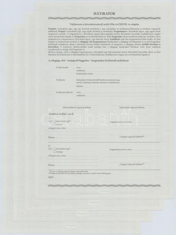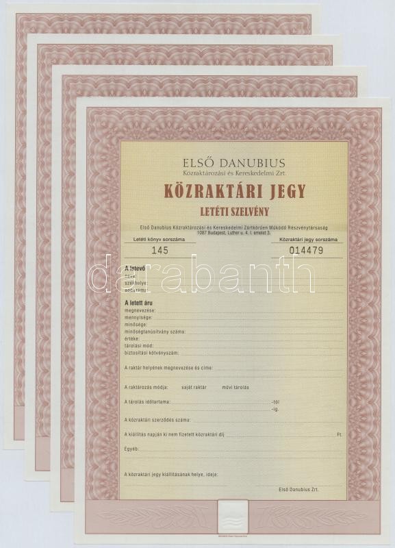 Beschreibung: ~1990. "Első Danubius Közraktározási és Kereskedelmi Zrt. Közraktározási Jegy" kitöltetlen zálogjegy (4x) sorszámkövetők T:I,I-