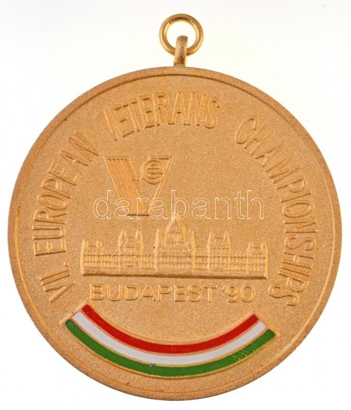 1990. "VII. European Veterans Championships Budapest / Közreműködésért OVASE" aranyozott, zománcozott fém érem füllel (60mm) T:1-,2