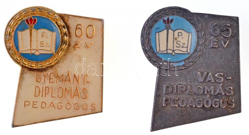 Beschreibung: ~1970-1980. "60 év - Gyémántdiplomás pedagógus" + "65 év - Vasdiplomás pedagógus" zománcozott fém jelvények T:2
