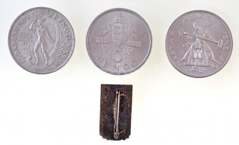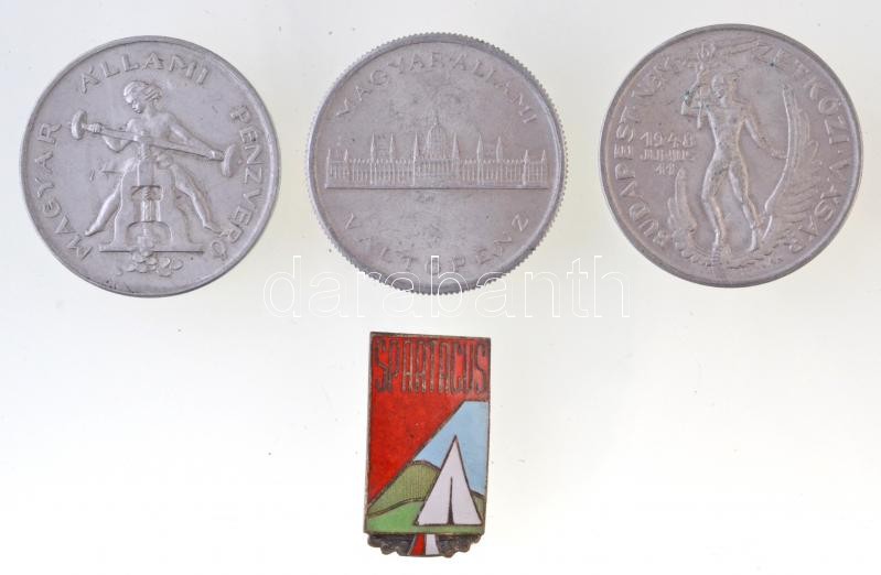 Beschreibung: 1945. 5P Al + Iván István (1905-1968) 1948. "Magyar Állami Pénzverő / Budapesti Nemzetközi Vásár" Al emlékérem (2x) + DN "Spartacus" zománcozott fém jelvény T:2