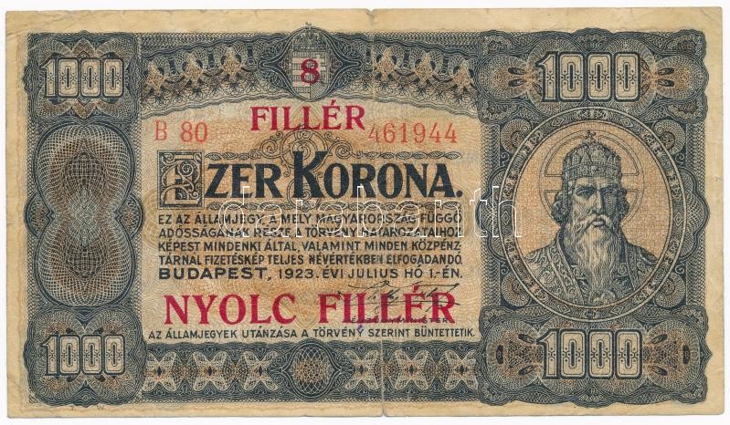 1923. 1000K "8 FILLÉR - NYOLC FILLÉR" felülnyomással T:III-