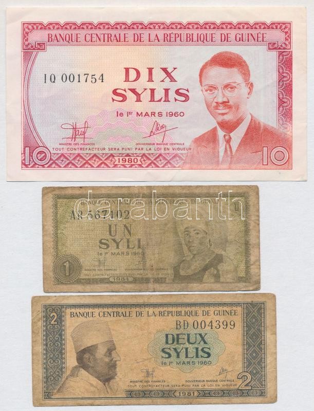 Guinea 1980. 10 Sylis + 1... https://www.darabanth.com/de/326-Fernauktion/326.0/Numismatik/Weltweit-Banknoten~2000012/Guinea-1980-10S-plus-1981-1S-plus-2S-TIII-III--Guinea-1980-10-Sylis-plus-1981-1-Sylis-plus-2-Sylis-TIII-I~II1816193