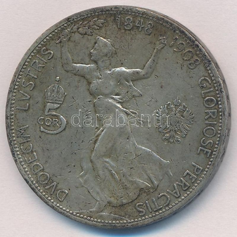 Austria 1908. 5 Corona Ag "Franz Joseph - Jubilee" C:VF patina, edge error