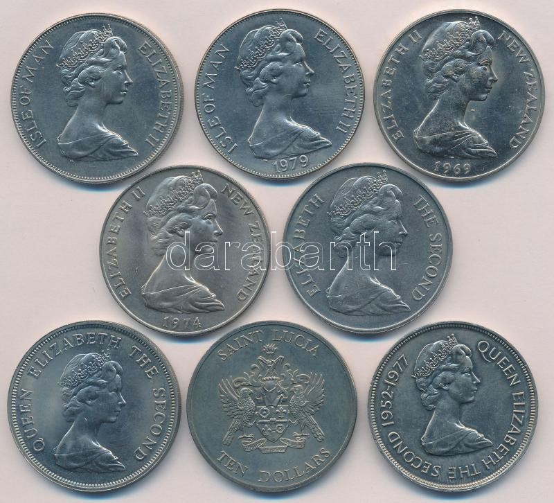 Isle of Man 1977. 1 Crown Cu-Ni "Silver Jubilee" + 1979. 1 Crown Cu-Ni "Millenium of Tynwald' + New Zealand "200th Anniversary - Captain Cook's Voyage" + 1974. 1 Dollar Cu-Ni "Commonwealth Games" + Saint Helena 1973. 25 Pence "St. Helena Tercentenary" + Tuvalu 1981. 5 Dollars Cu-Ni "Royal Wedding" + Saint Lucia 1982. 10 Dollars Cu-Ni "200th Anniversary - Battle of the Saints" + Jersey 1977. 25 Pence Cu-Ni "Queen's Silver Jubilee" C:AU,XF