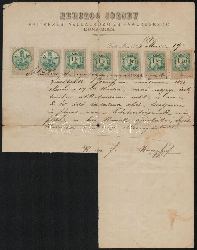 1893 Okmánydarab 2 x 5kr + 5 x 1kr díjlerovással Duna-Mocs https://www.darabanth.com/de/327-Fernauktion/327.0/Andere-Sammelgebiete/Dokument~1500016/1893-Okmanydarab-2-x-5kr-plus-5-x-1kr-dijlerovassal-Duna-Mocs~II1823339