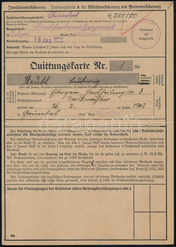 1939 Quittungskarte für Sudetenland No. 1. Érvényesítési bélyegekkel /... https://www.darabanth.com/de/327-Fernauktion/327.0/Andere-Sammelgebiete/Dokument~1500016/1939-Quittungskarte-fur-Sudetenland-No-1-Ervenyesitesi-belyegekkel-with-validation-stamps~II1588483