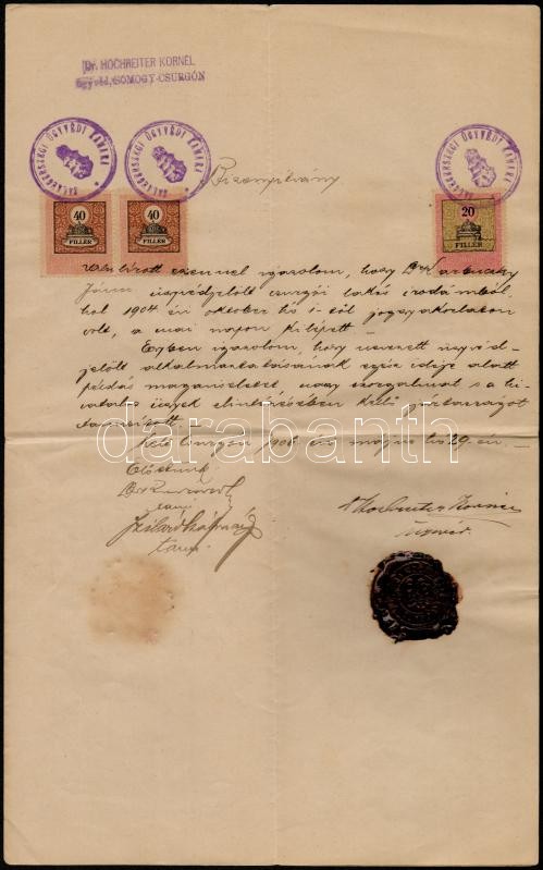 Beschreibung: 1906 Ügyvédjelölti bizonyÃtvány, Dr. Hochreiter Kornél ügyvéd által kiállÃtva, Csurgó, ügyvédi kamarai pecsétekkel, viaszpecséttel, aláÃrásokkal, 2 db 40 f. és 1 db 20 f. okmánybélyeggel.