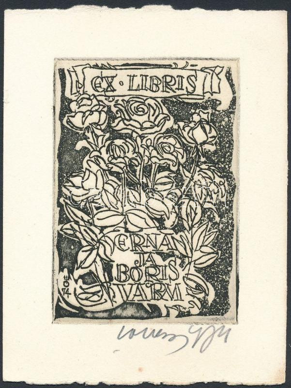 Evald Okas (): Ex libris Erna ja Boris Varm. Rézkarc, papír, jelzett, ... https://www.darabanth.com/de/327-Fernauktion/327.0/Andere-Sammelgebiete/Ex-libris-Kleingrafik~1500003/Evald-Okas-Ex-libris-Erna-ja-Boris-Varm-Rezkarc-papir-jelzett-9C39765-cm~II1419785