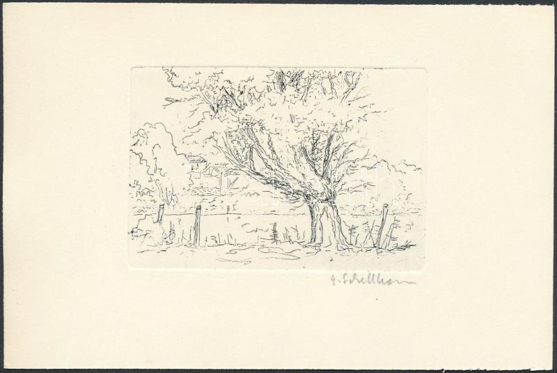 Beschreibung: Gerald Schellhorn(1940-?): Ház az erdő szélén. Rézkarc, papír, jelzett, 55x7,5 cm