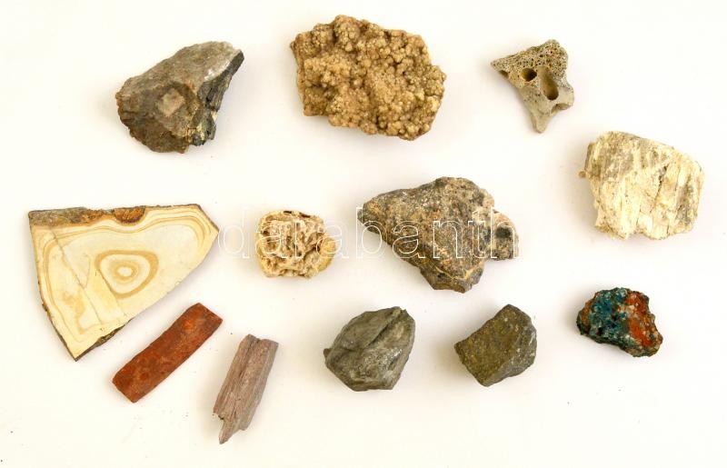 Beschreibung: 10 db különféle érdekes ásvány és kőzet, különböző méretben