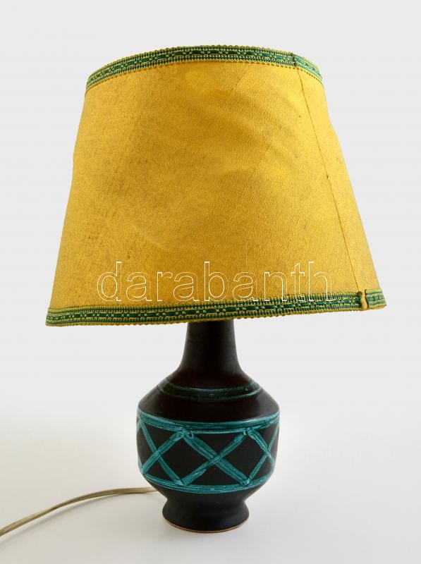 Beschreibung: Iparművész asztali lámpa, festett mázas kerámia, alján apró lepattanással, burával (belül szakadással), működik, m:40 cm