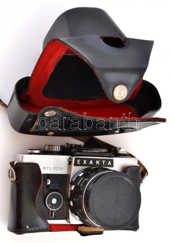 Ihagee Exakta RTL 1000 kisfilmes SLR fényképezőgép, Meyer-Optik Görlitz Oreston 50mm f/1.8 objektívvel, sérült (cserélhető) tüköraknával, sérült szűrőmenettel, működőképes állapotban, eredeti bőr tokjában / Vintage German 35mm SLR camera, in faulty but working condition, with original leather case